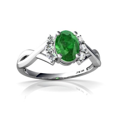 This ring is the epitome of elegance, with its criss-crossed golden setting, which holds absolutely stunning stones. The ring features a lovely, oval cut gemstone of your choice, surrounded by six dazzling diamonds, for a look that is extremely feminine, delicate, and classic. Also available are lovely matching earrings and a pendant, for a set that will become an instant heirloom.This ring features a 7X5mm oval-cut emerald center stone, surrounded by 6 sparkling diamonds. The total gem weight for the ring is 1.1 carats, set in solid 14k gold. The band is /16 of an inch at its widest point tapering down to /16 of an inch at the back, and is /16 of an inch high off the finger.